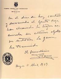 “En el día de hoy, vencido y desarmado el Ejército Rojo, han alcanzado las tropas nacionales sus últimos objetivos militares. La guerra ha terminado.” El Generalísimo, (firmado) Francisco Franco.